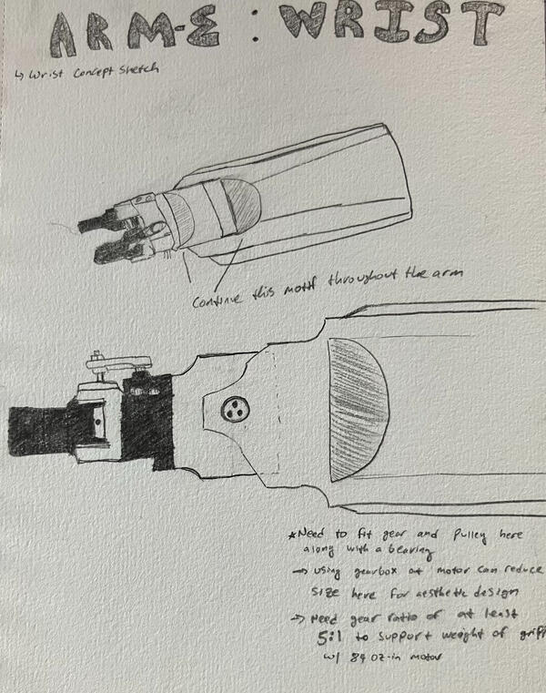 I plan to use a timing belt to drive the wrist joint with a stepper motor that will be mounted further towards the elbow to reduce torque required from the motor. Sketching allows me to get design ideas out of my head - this helps me to have before jumping to CAD.