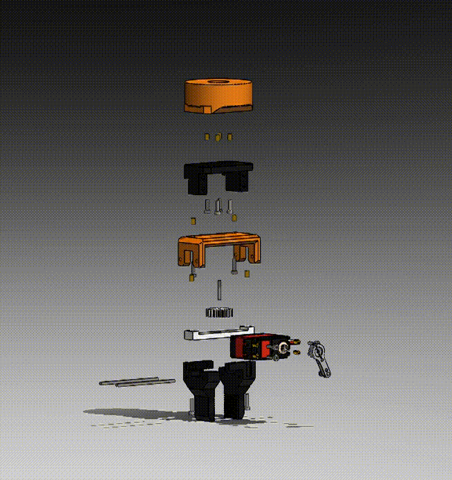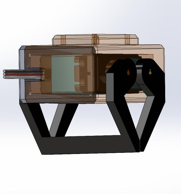 The gripper is the first module being designed. Pictured above was the first prototype. This design was not chosen due to complexity, it required three bearings and shafts.