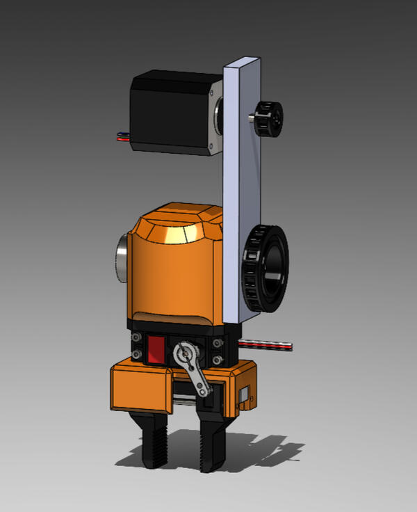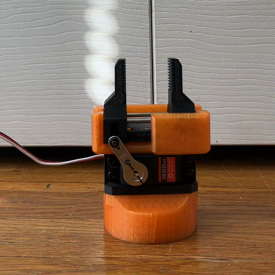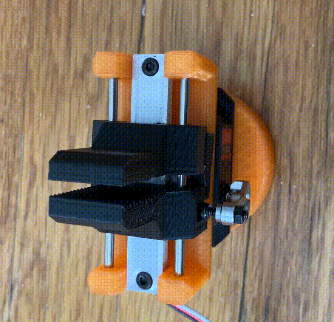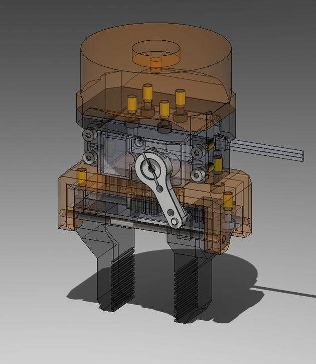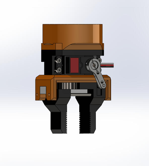 This is the second and current gripper design, it operates using a rack and pinion between the jaws of the gripper. This design is favored for its simplicity.